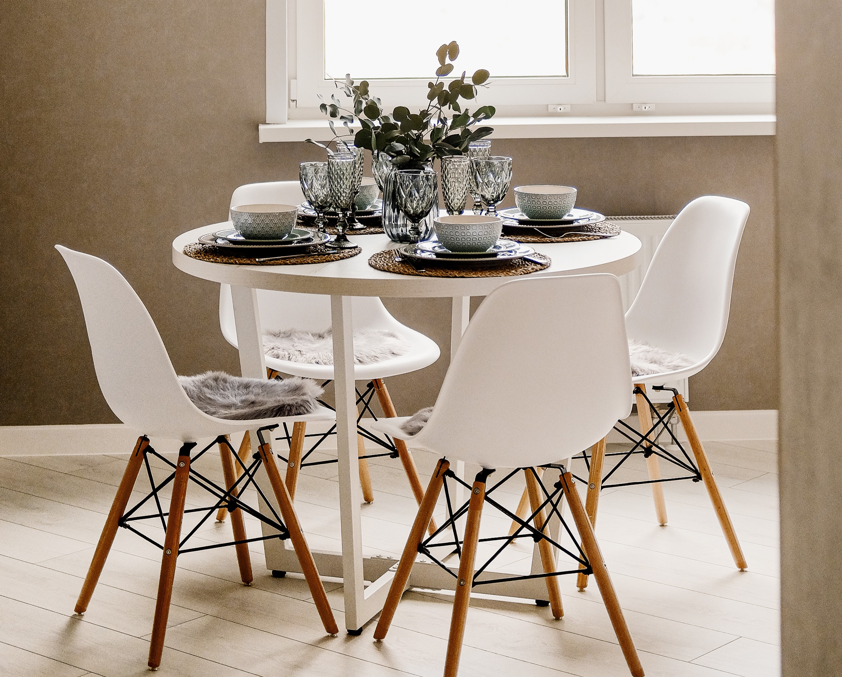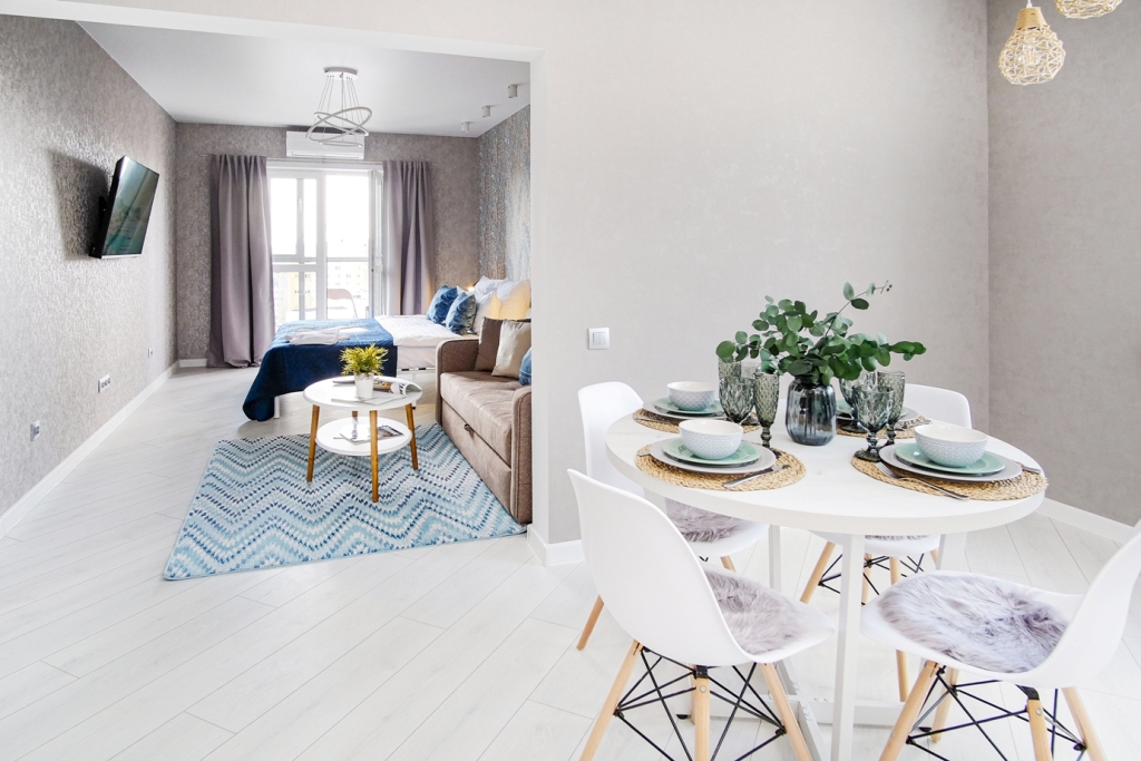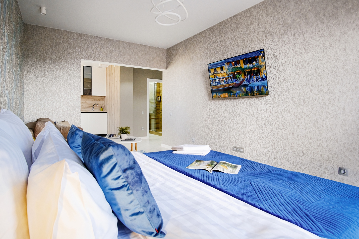 - Мебель: вешалка, диван, зеркало, кровать двуспальная, прикроватные тумбочки, стол, стулья, шкаф
